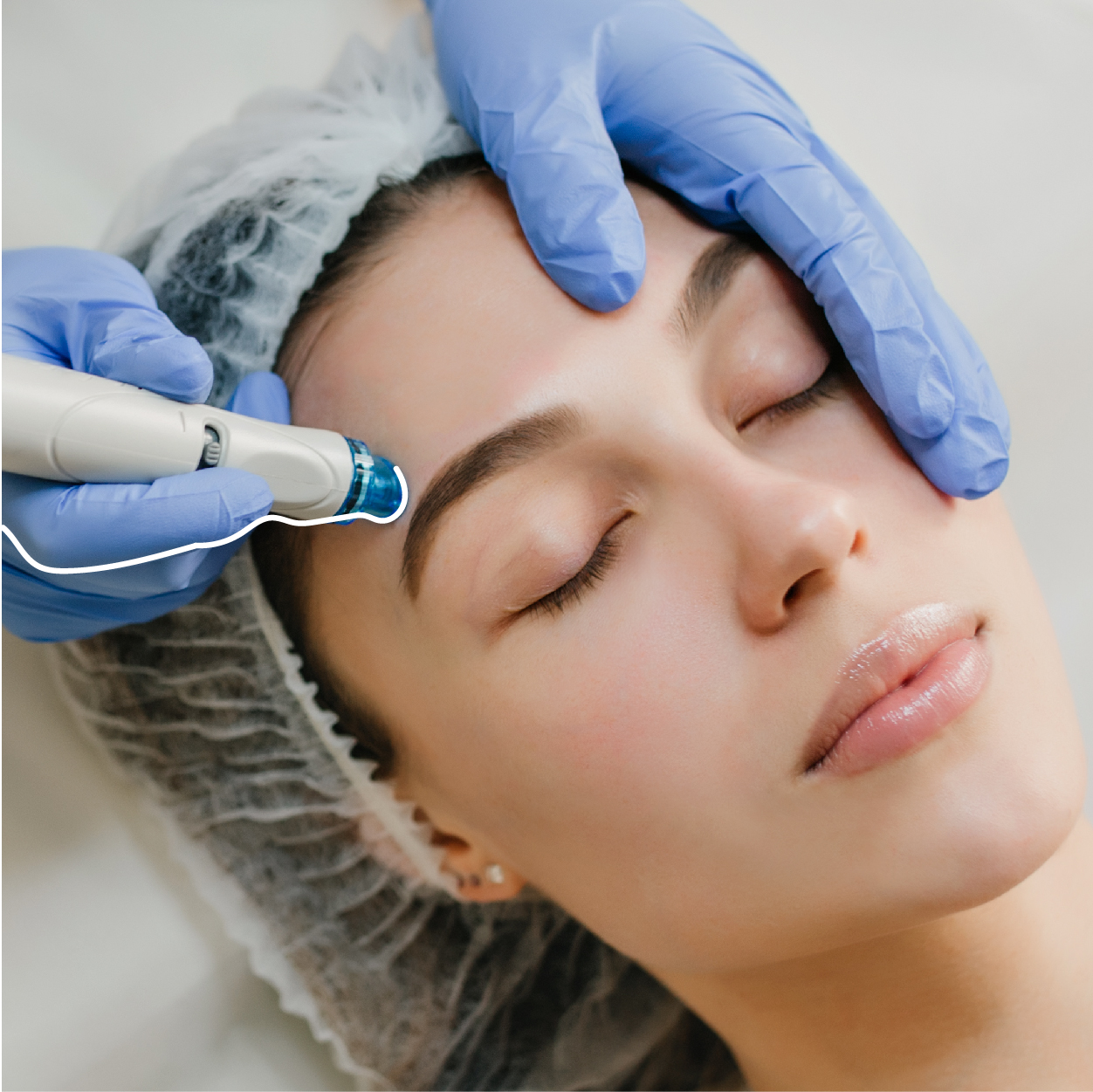 górnej 1/3 twarzy (czoło, skronie) – likwidacja przebarwień, zmarszczek, makijażu permamentnego, uniesienie brwi (lasery frakcyjne i VPL, botox, mezoterapia, osocze bogatopłytkowe, MeLine, PRX, nici liftingujące i strukturalne, Ulthera)